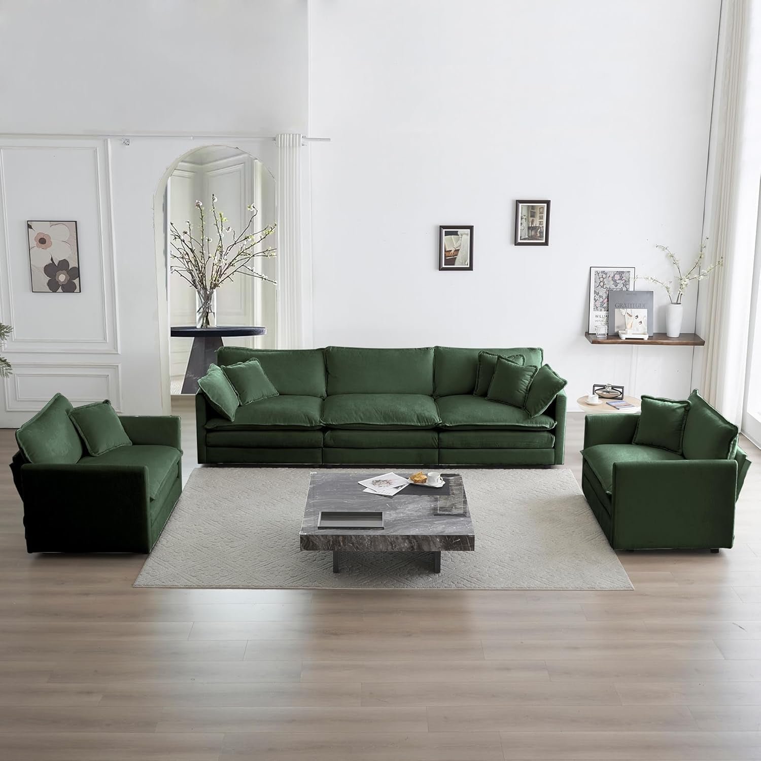 Luxury 3 Piece Sofa Set, 2 Pieces of Single Sofa and 1 Piece of 3 Seater Sofa, Modern Chenille Comfy Cloud Couches Set with 7 Pillows for Living Room Office, Evergreen