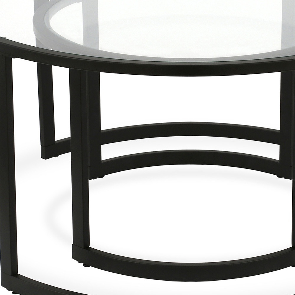 Show off your exquisite taste with this set of two black glass and steel round sled nested coffee tables. The nesting feature is a great space saver for when not in use. A sleek black monotone color gives this steel and glass table a fresh and updated look. This round table utilizes its unique shape to give your room a modern geometric accent. It has an attractive design that will definitely breathe some fresh air into your interior. 18-inch h x 36-inch w x 36-inch d.