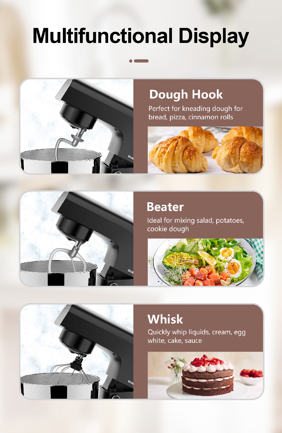 Brand: SVEWT Model: SM-1540 Name: Stand Mixer Rated Voltage: 220-240V Frequency: 50-60Hz Power Consumption: 1500W Protection Class: II Speed Setting: 10 Speed Control Noise Level: ≤ 75 dB Mixing Action: Planetary Mixing Color: Black |